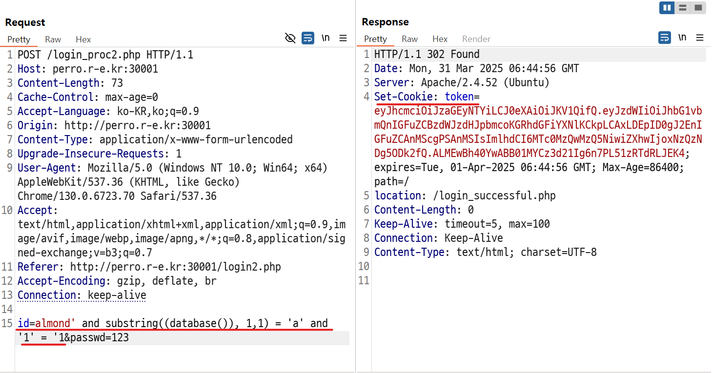 3. id 파라미터에 SQL 쿼리를 삽입해 데이터베이스 명의 첫자리가 a임을 알아냅니다.