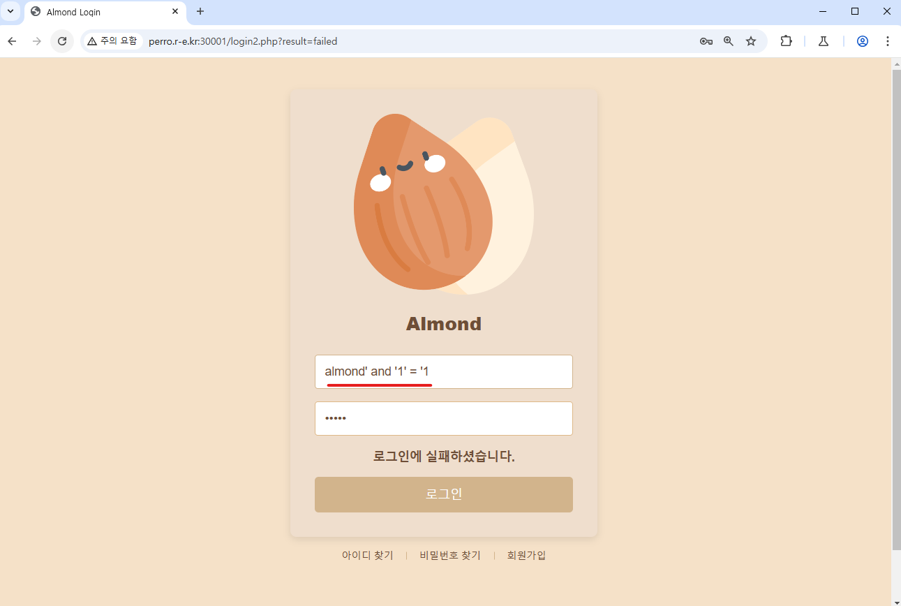 2. 로그인에 실패하는 것으로 and '1'='1' 참 쿼리가 실행된 것이 아니라 문자열로 취급된 것을 확인합니다.
