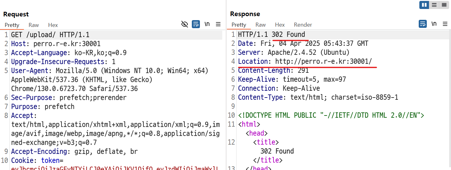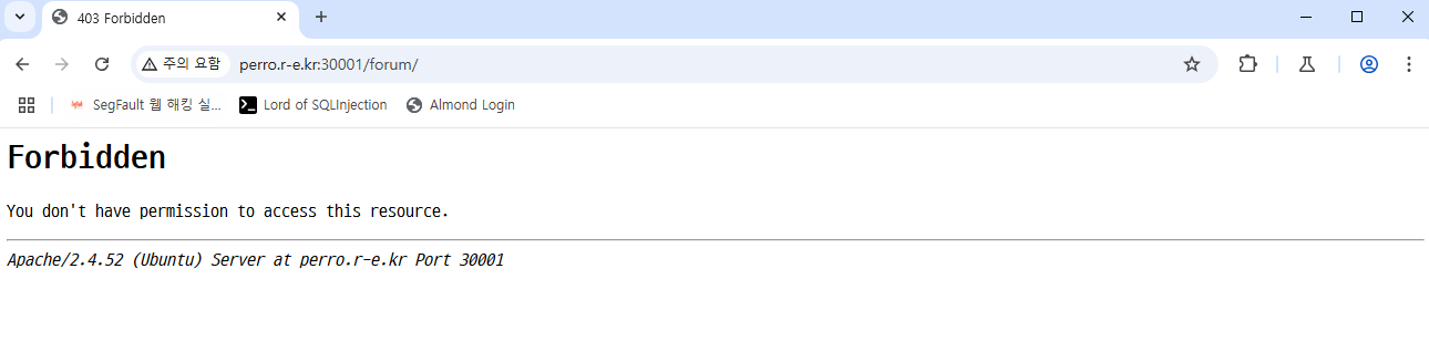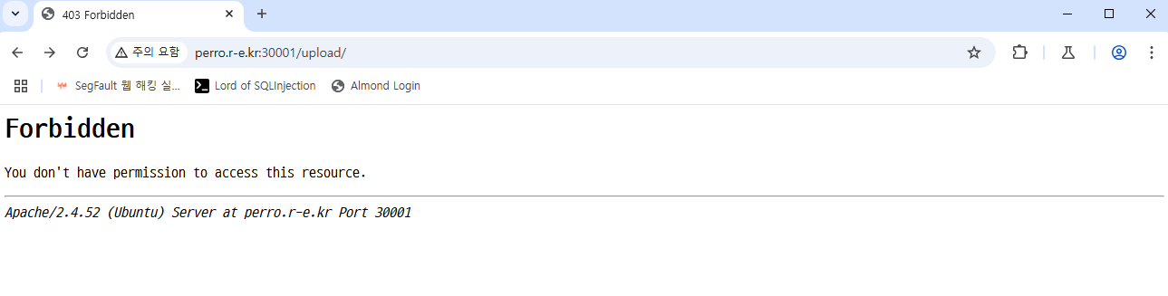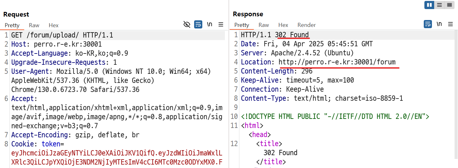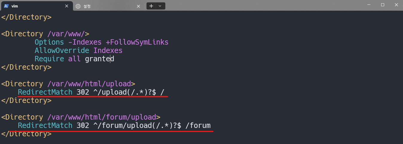 서버 설정을 통해 /upload, /forum/upload 디렉터리에 직접 접근할 경우, 403 Forbidden 에러 대신 지정한 경로로 리다이렉트 되도록 구성하였습니다. 이를 통해 사용자 경험을 향상할 수 있으나, 현재 게시판의 파일 다운로드 기능이 업로드 폴더에 대한 직접 접근 방식으로 구현되어 있어, 추후 download.php와 같은 별도의 다운로드 처리 로직을 추가할 필요가 있습니다.