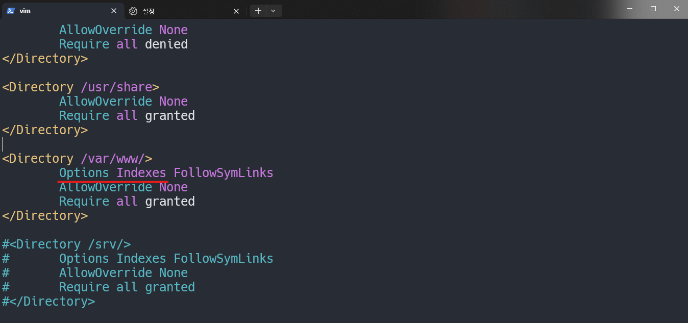 아파치의 기본 설정 파일인 apache2.conf에서 Options Indexes 옵션이 활성화되어 디렉터리 인덱싱 기능이 적용된 상태입니다.