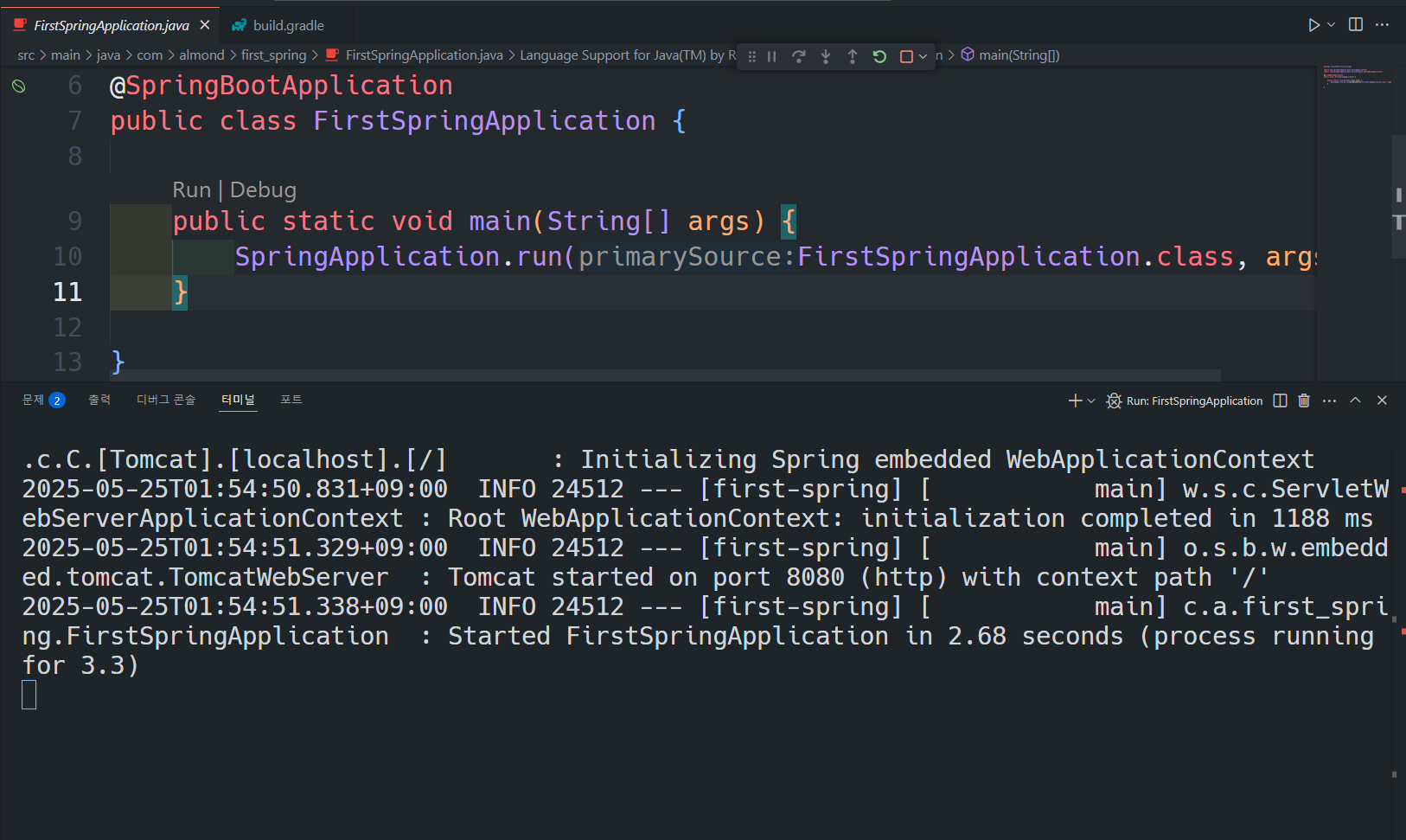 6. @SpringBootApplication 어노테이션이 붙은 클래스의 main 메서드를 실행하여 스프링 애플리케이션을 시작합니다.