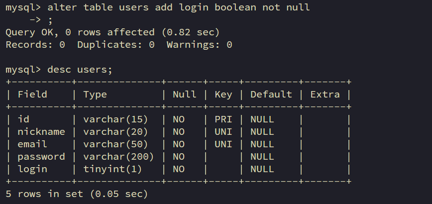 일단 mysql에 로그인 온/오프를 기록하기 위한 Boolean 타입 컬럼(열)을 하나 만들었습니다.