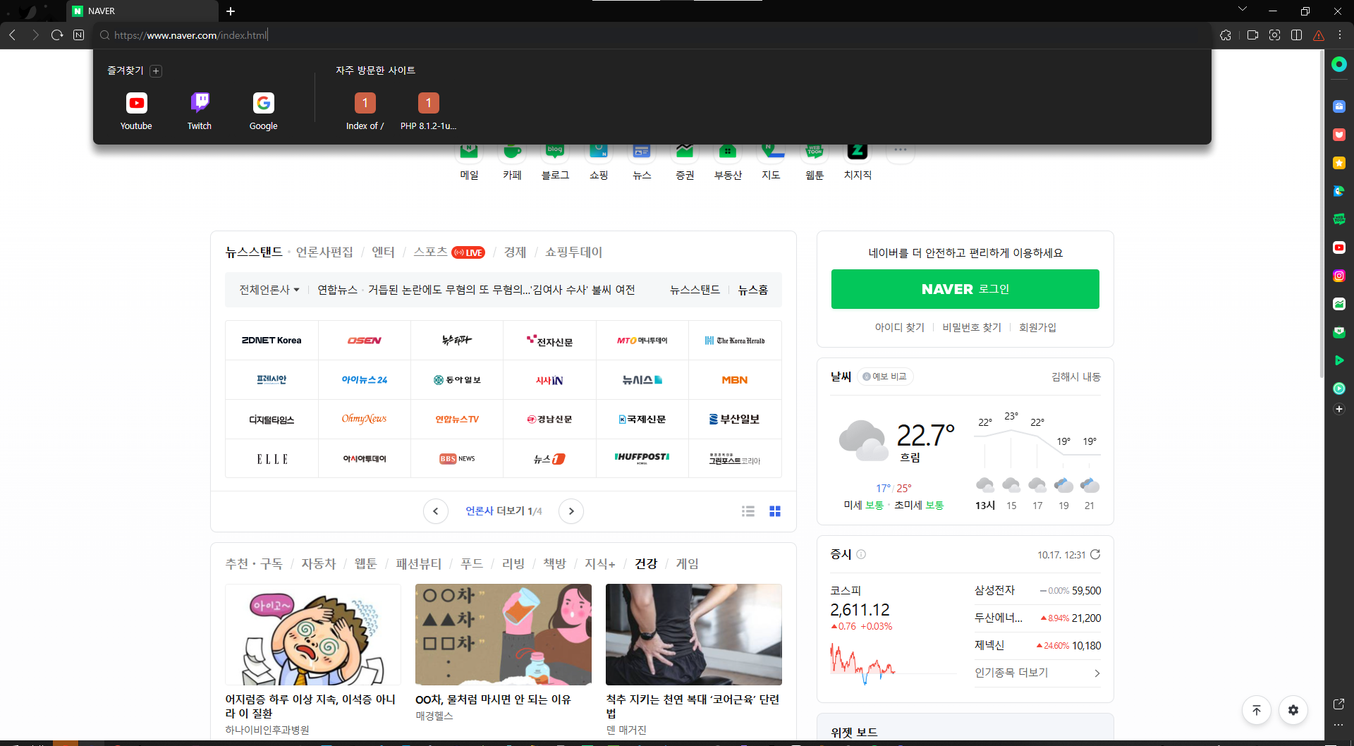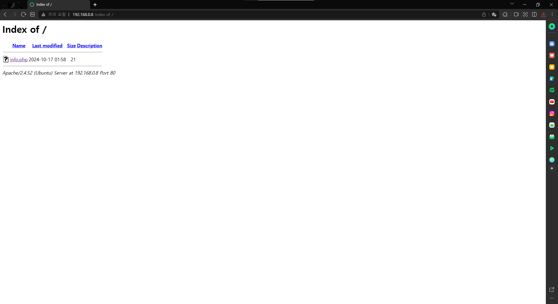 제가 만든 아파치 서버는 192.168.0.8로 접속했고, 네이버는 naver.com으로 접속했습니다.