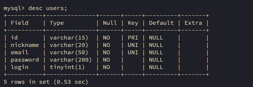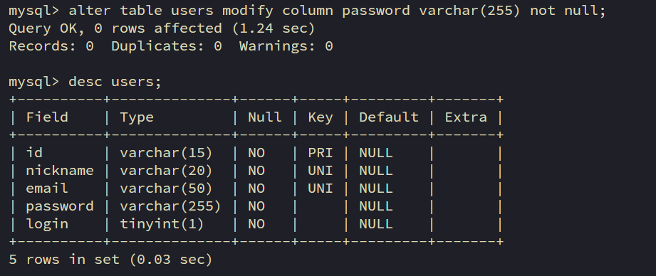 비밀번호에 해쉬를 저장하기 위해서 varchar(512)로 최대 512바이트까지 저장하도록 변경했습니다.
