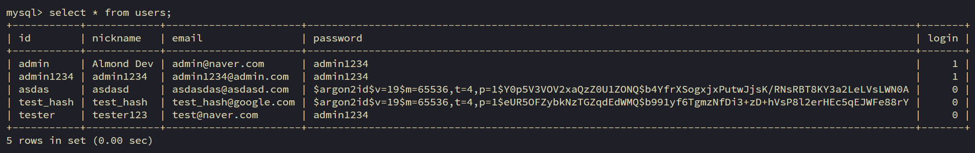 정말로 다른 해시가 생성되는지 확인하기 위해 식별 - 인증 동시방법을 사용했을 때 로그에 남은 sql문입니다.