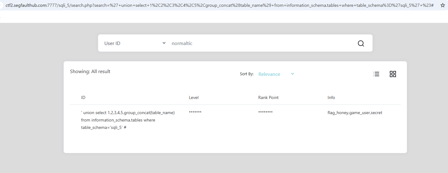 5> Table 알아내기 ( flag_honey, game_user, secret )