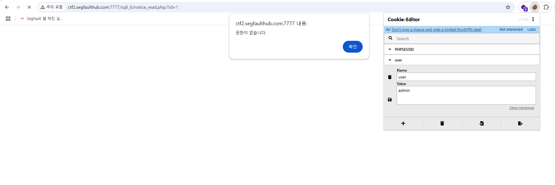 user 쿠키를 변조했을 때 출력되는 아이디가 변경되는 것으로 쿠키의 값으로 sql 질의문을 하는 것으로 보입니다.