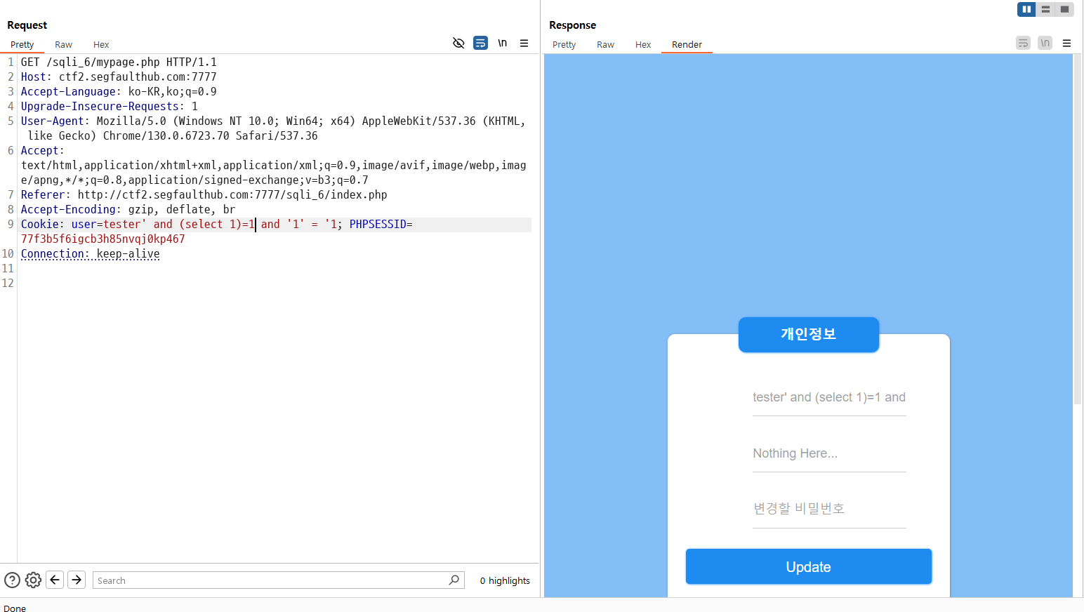tester' and (select 1)=1 and '1' = '1을 삽입해 select문이 정상적으로 동작하는지 확인하였습니다.