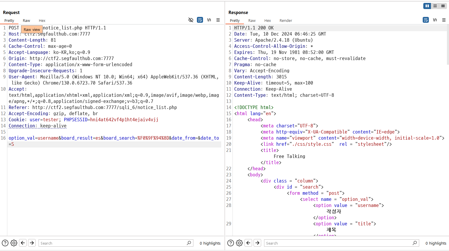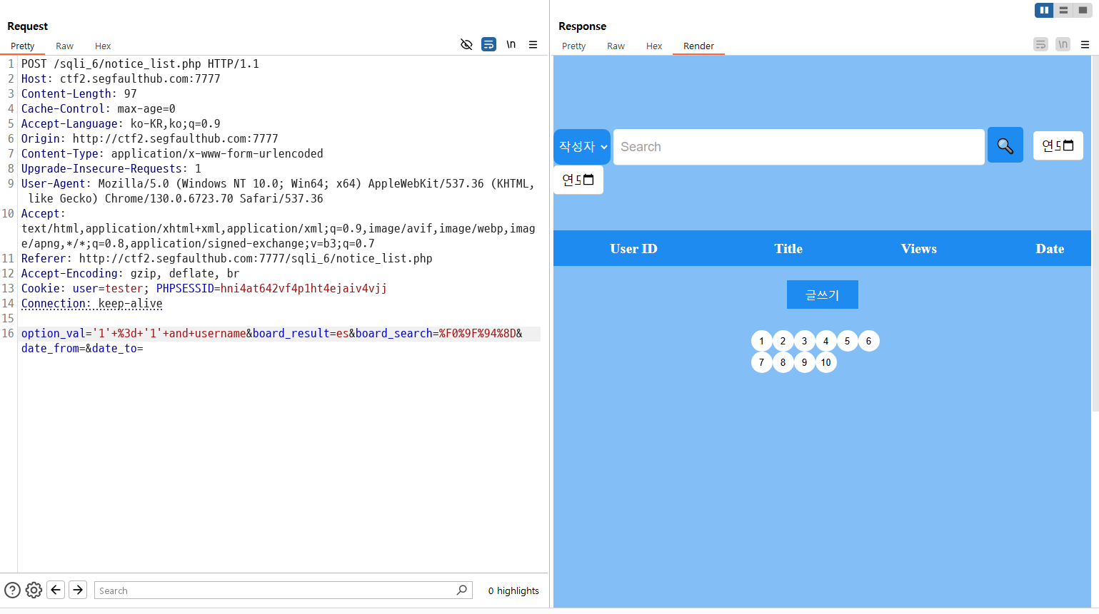 기능 분석에서 찾은 다른 sqli point인 게시판의 검색기능과 게시글 확인 기능은