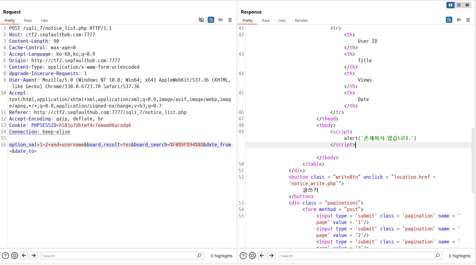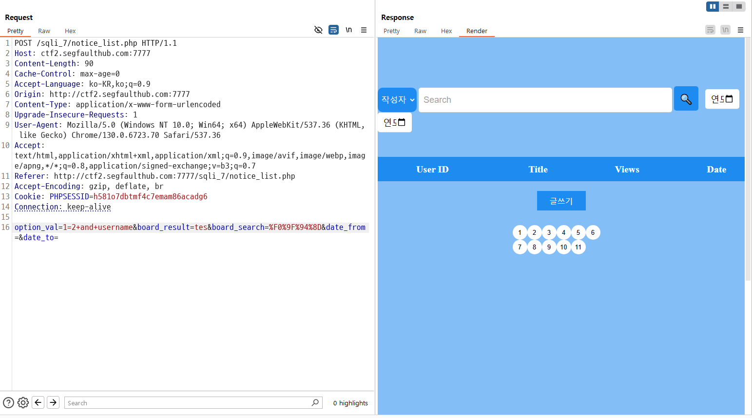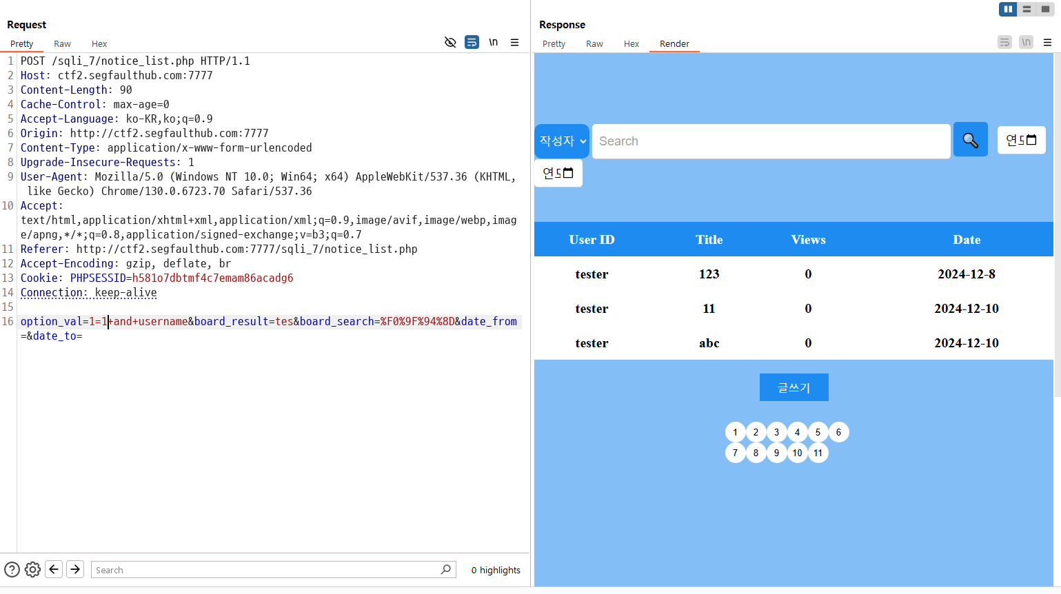 mypage.php의 sqli point는 막혔지만 여전히 게시판 검색과 게시글 읽기에서의 취약점은 존재했습니다.