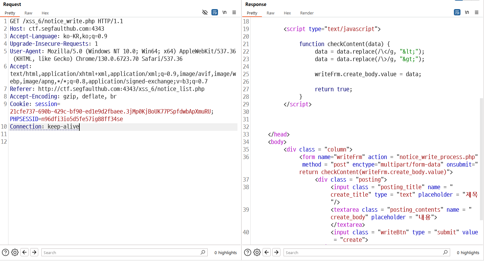 게시글을 작성하는 페이지를 보면 checkContent라는 자바스크립트 코드로 < >를 치환하는 것을 볼 수 있습니다.