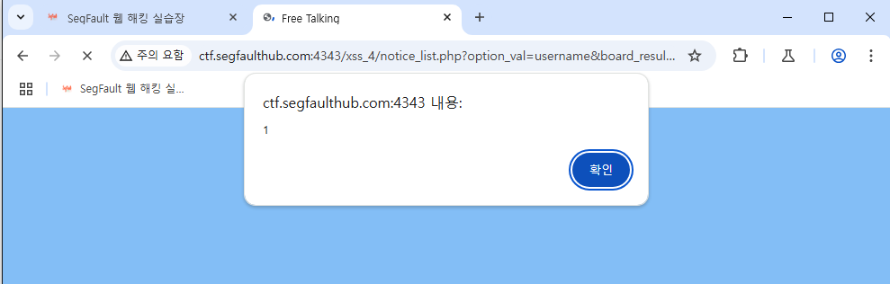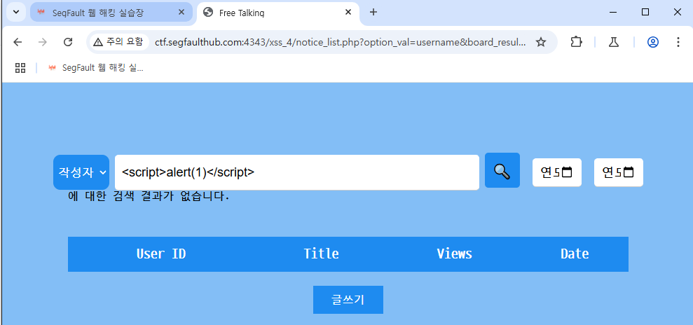검색어에 <script> alert(1)</script>을 입력하면 스크립트가 실행되는 것을 확인할 수 있습니다.
