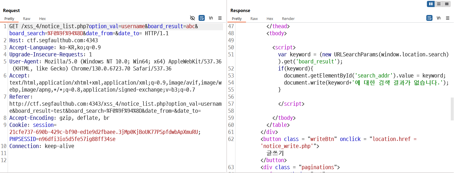 서버의 응답값을 보면 document.write라는 스크립트가 존재합니다.