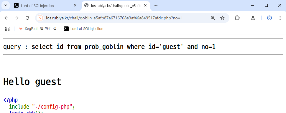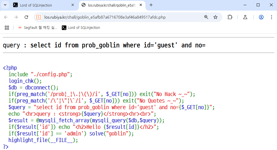 $query = "select id from prob_goblin where id='guest' and no={$_GET[no]}";