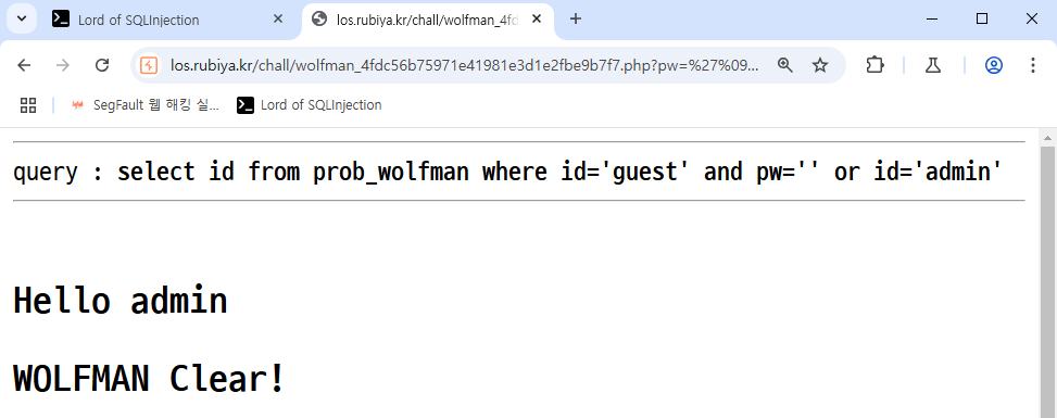 select id from prob_wolfman where id='guest' and pw='' or id='admin'