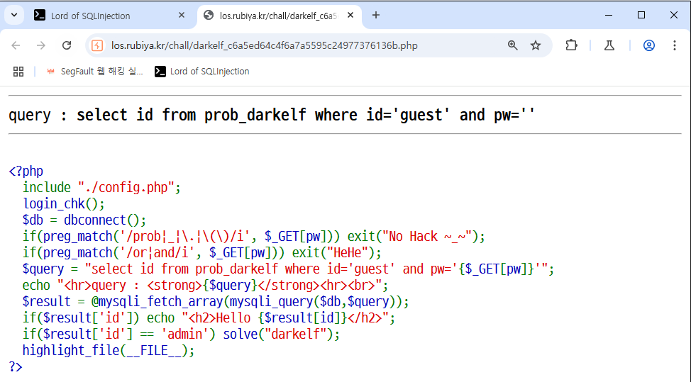 $query = "select id from prob_darkelf where id='guest' and pw='{$_GET[pw]}'";