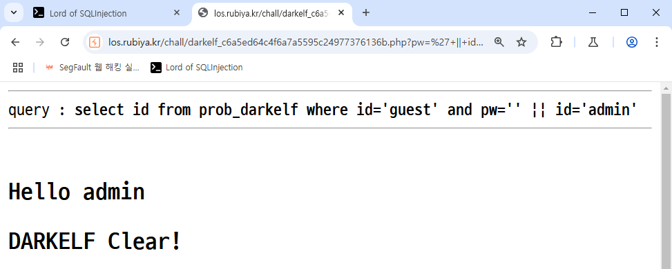 select id from prob_darkelf where id='guest' and pw='' || id='admin'