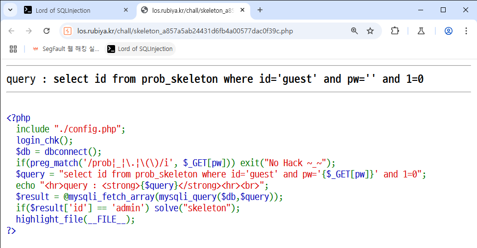 $query = "select id from prob_skeleton where id='guest' and pw='{$_GET[pw]}' and 1=0";