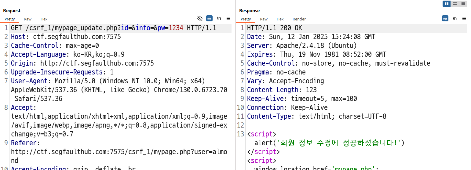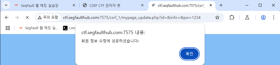 CSRF 취약점으로 링크로 접속을 유도해 비밀번호를 변경할 수 있습니다.