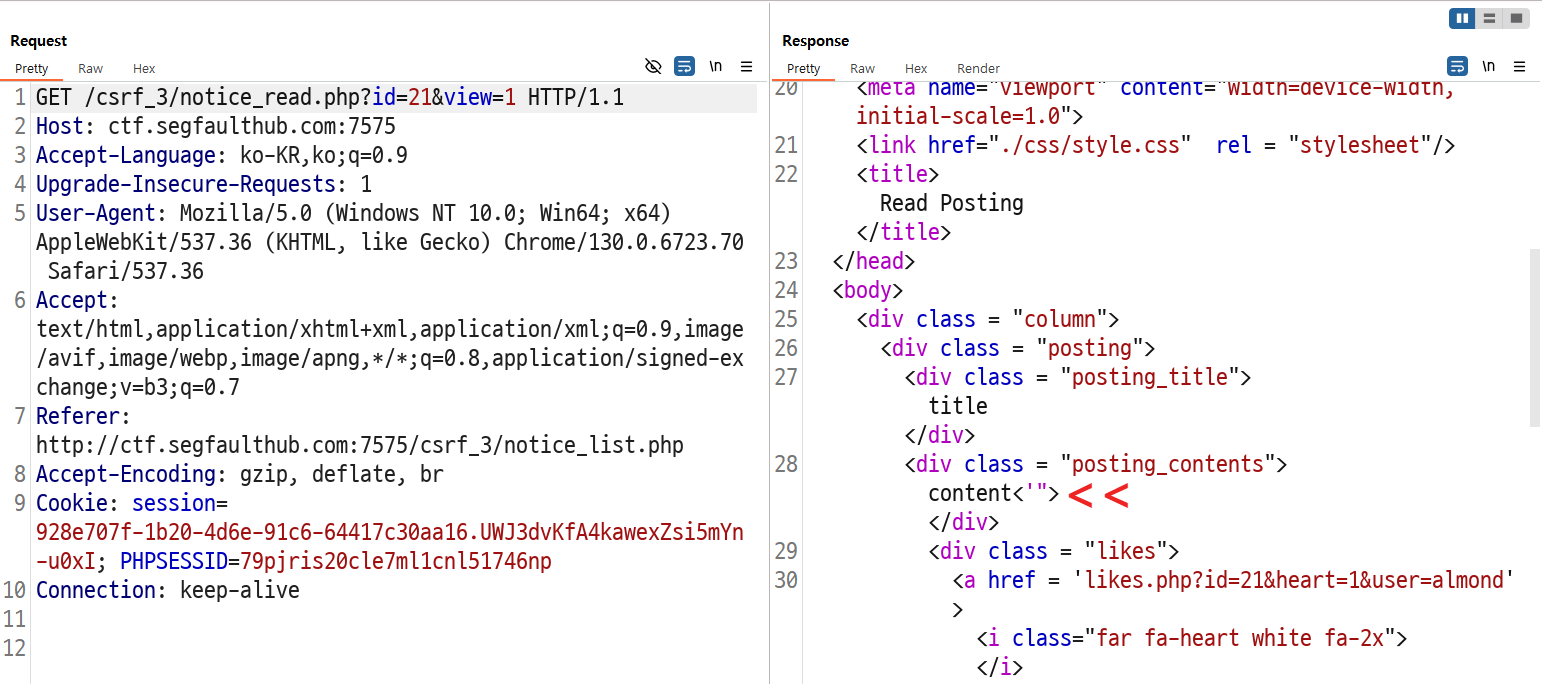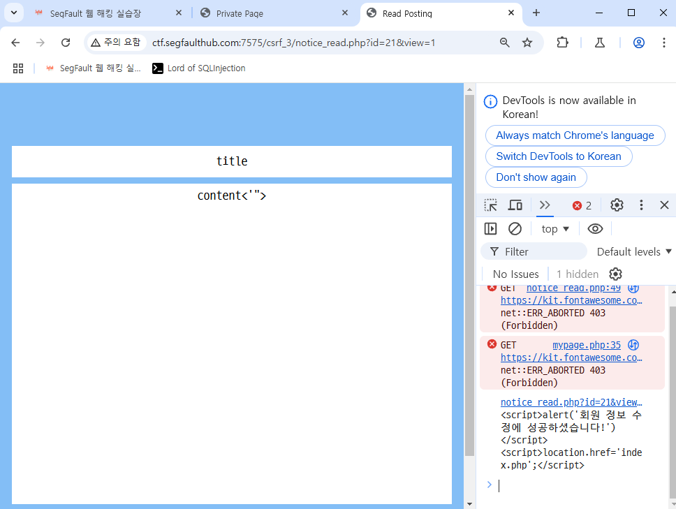 게시판 글 작성에서 JS를 삽입해 CSRF Token을 탈취한 뒤 CSRF 공격을 하도록 하겠습니다.