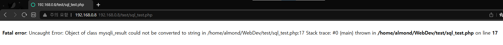 : Uncaught Error: Object of class mysqli_result could not be converted to string in /home/almond/WebDev/test/sql_test.php:17 Stack trace: #0 {main} thrown in