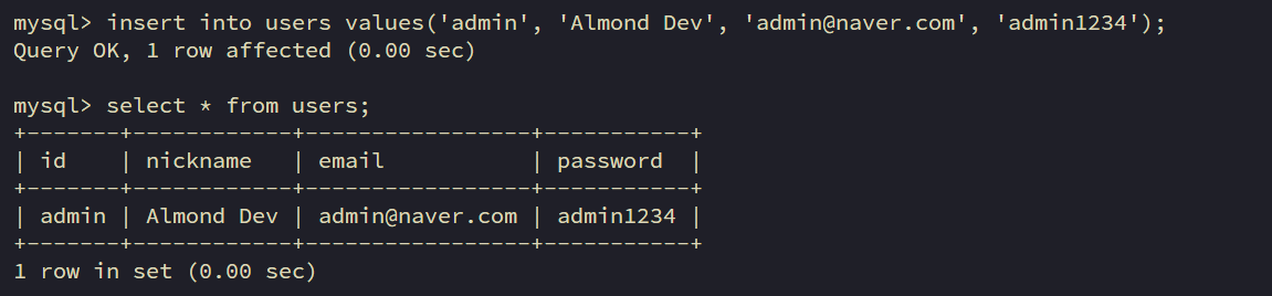 insert into users values('admin', 'Almond Dev', 'admin@naver.com', 'admin1234');