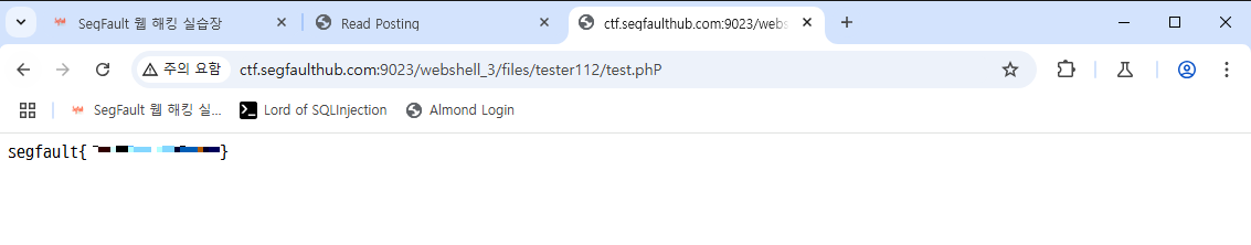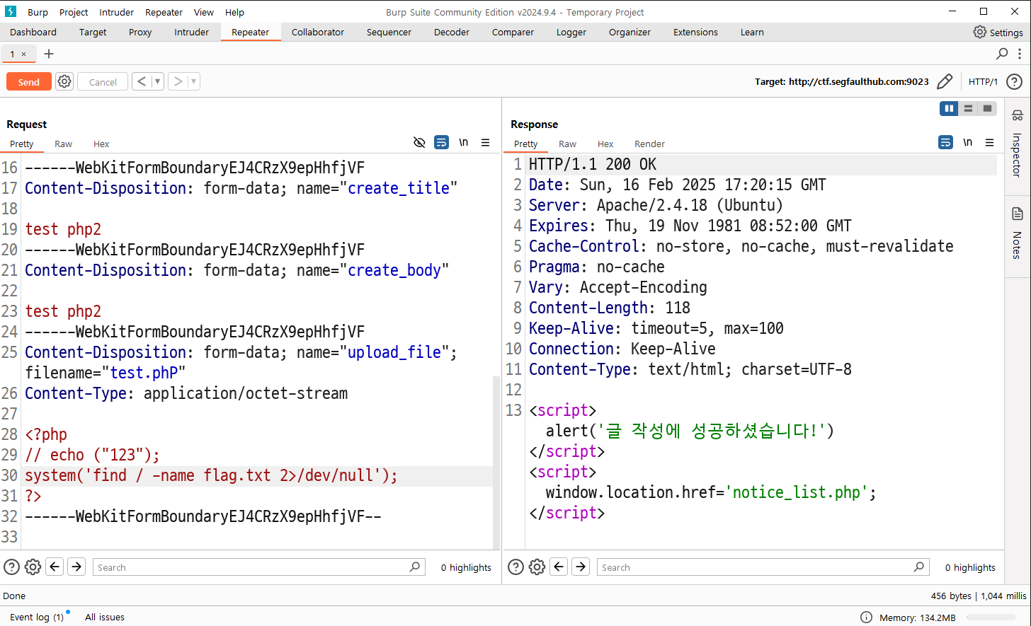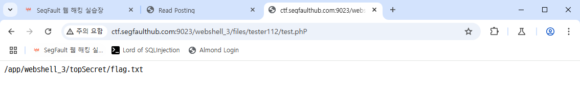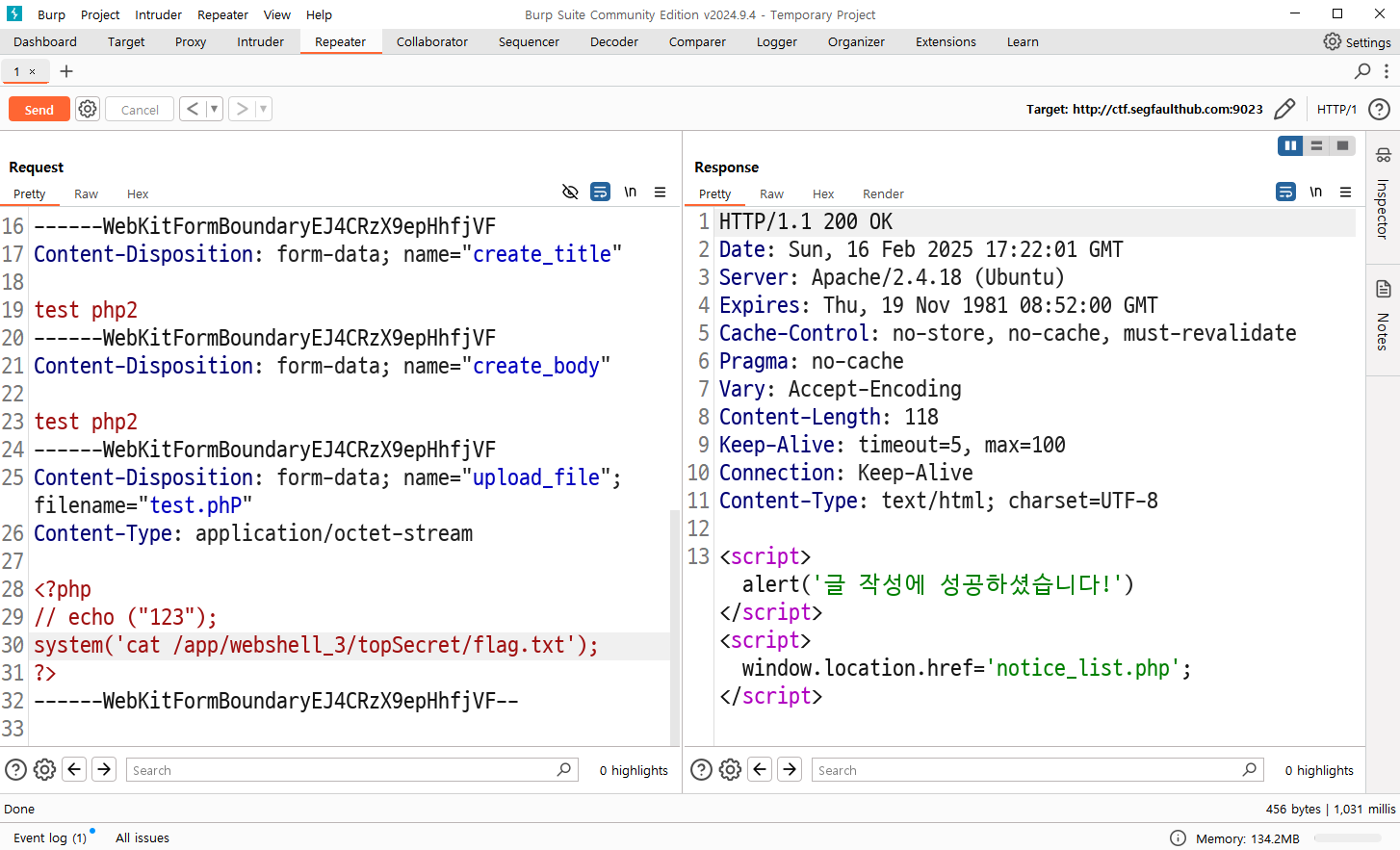 파일 업로드 취약점을 찾고 php 코드를 실행까지 했다면 이제는 끝입니다.flag.txt 파일을 찾는 웹쉘을 업로드하고 실행합니다.