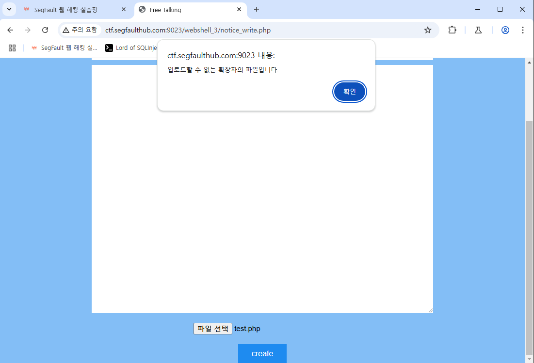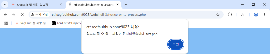 실패 메시지가 출력될 때 경로가 변경되었습니다. 서버에 요청은 정상적으로 보내졌는데 서버에서도 확장자 검사를 하고 있는 것 같습니다.