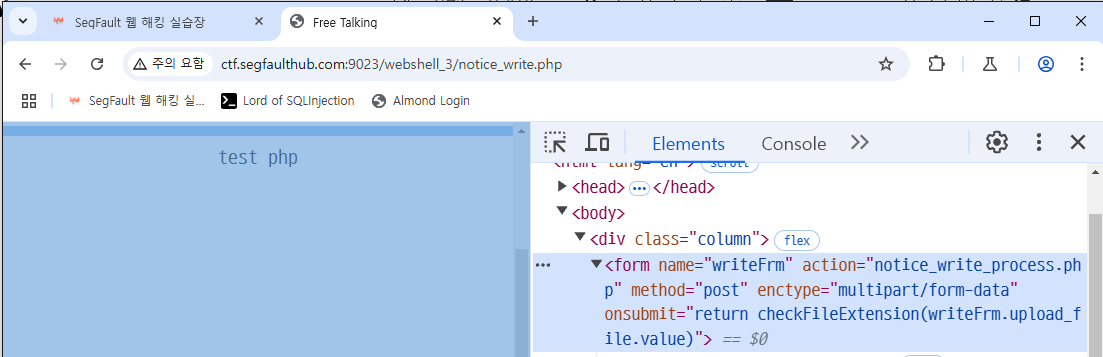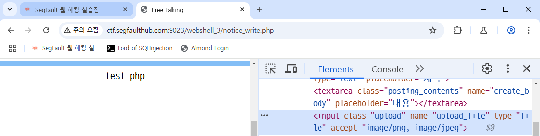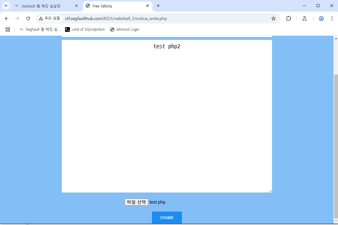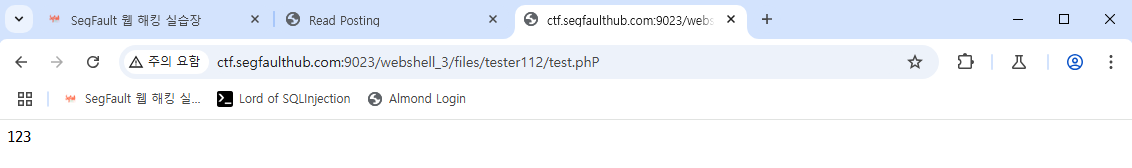 test.phP 파일에 접근하여 php 코드가 정상적으로 실행되는 것을 확인했습니다.