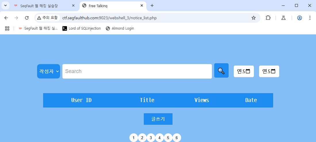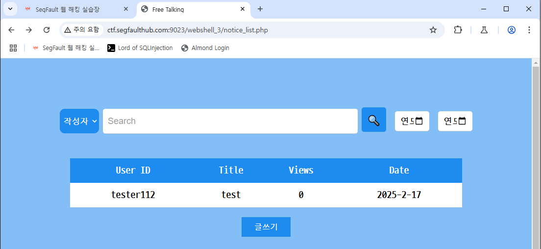 게시판에 접근하여 글쓰기 기능에 접근이 가능한지 확인합니다.
