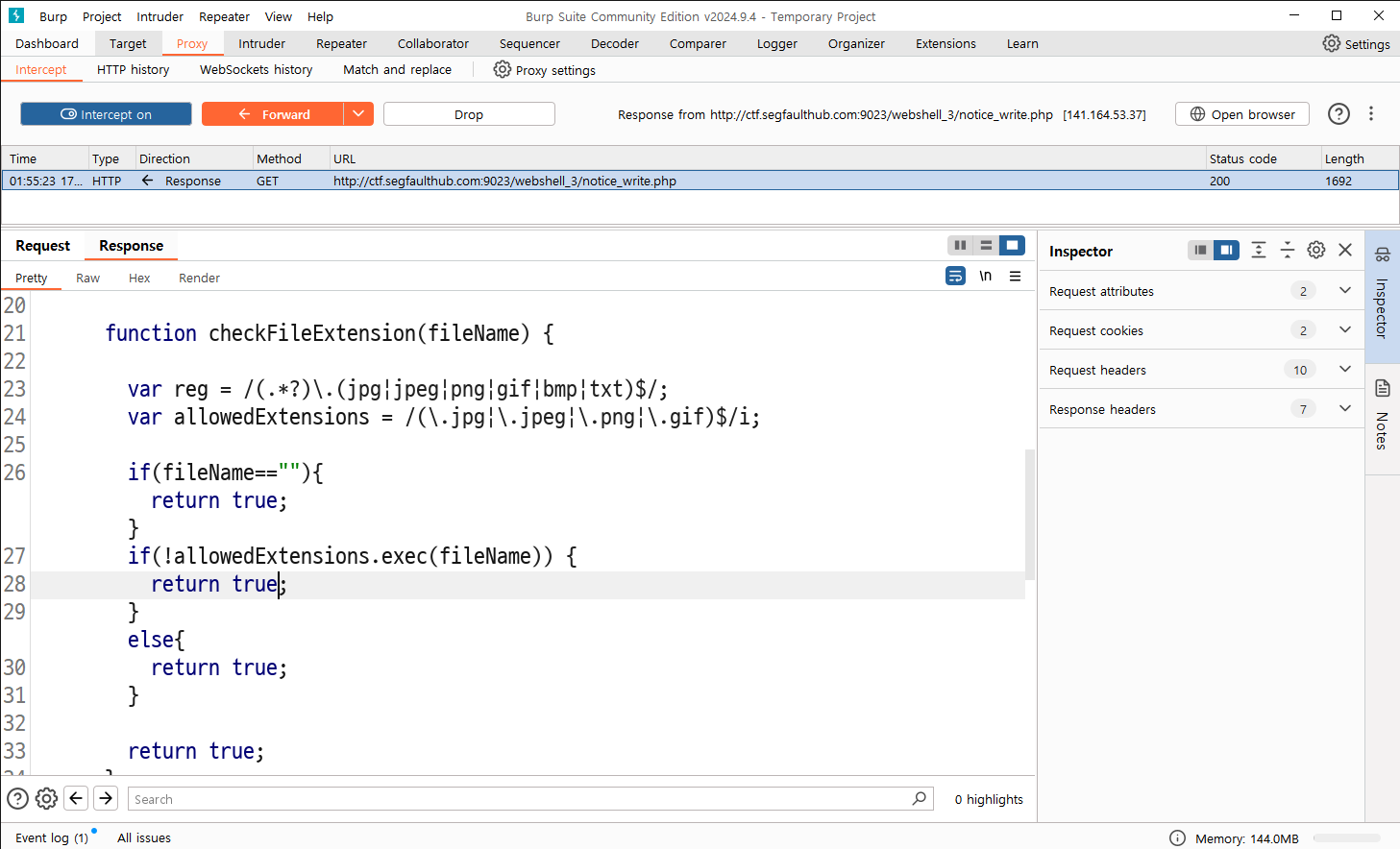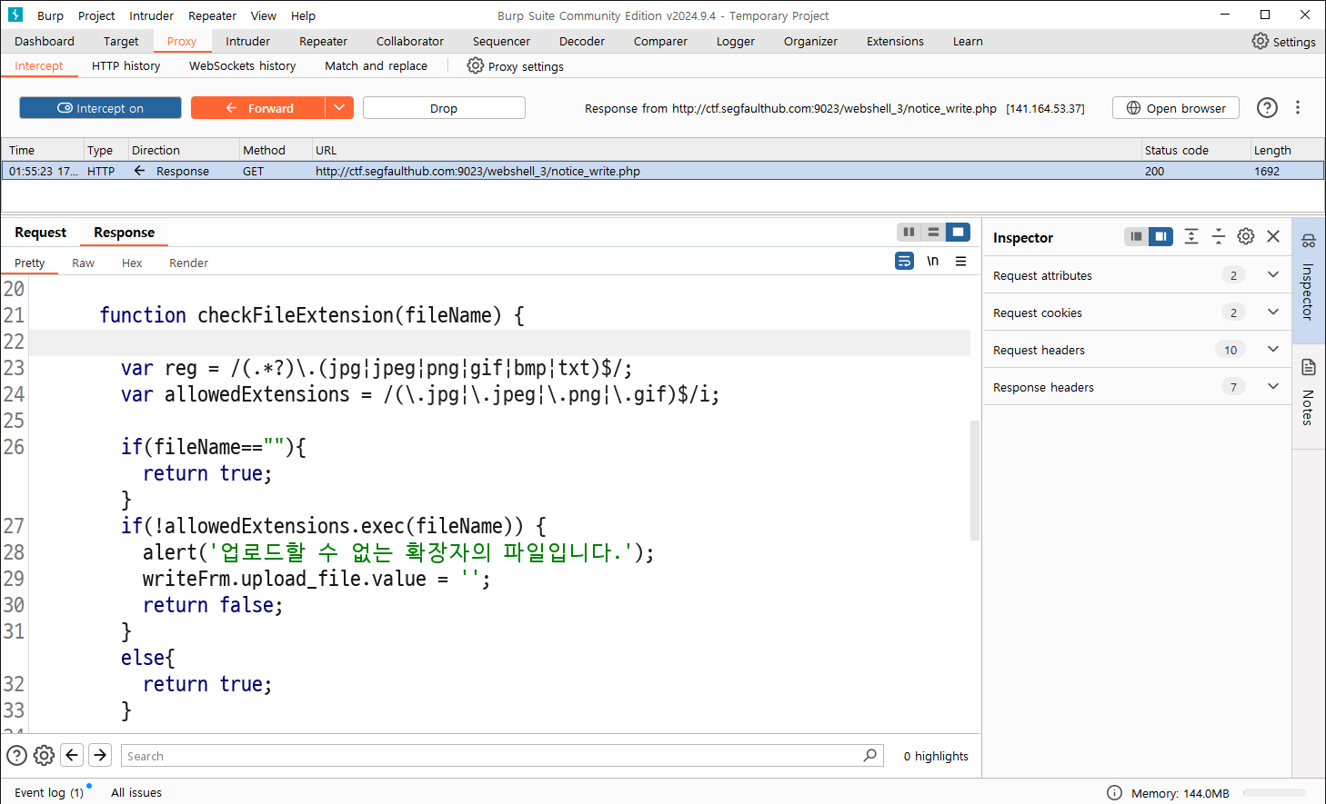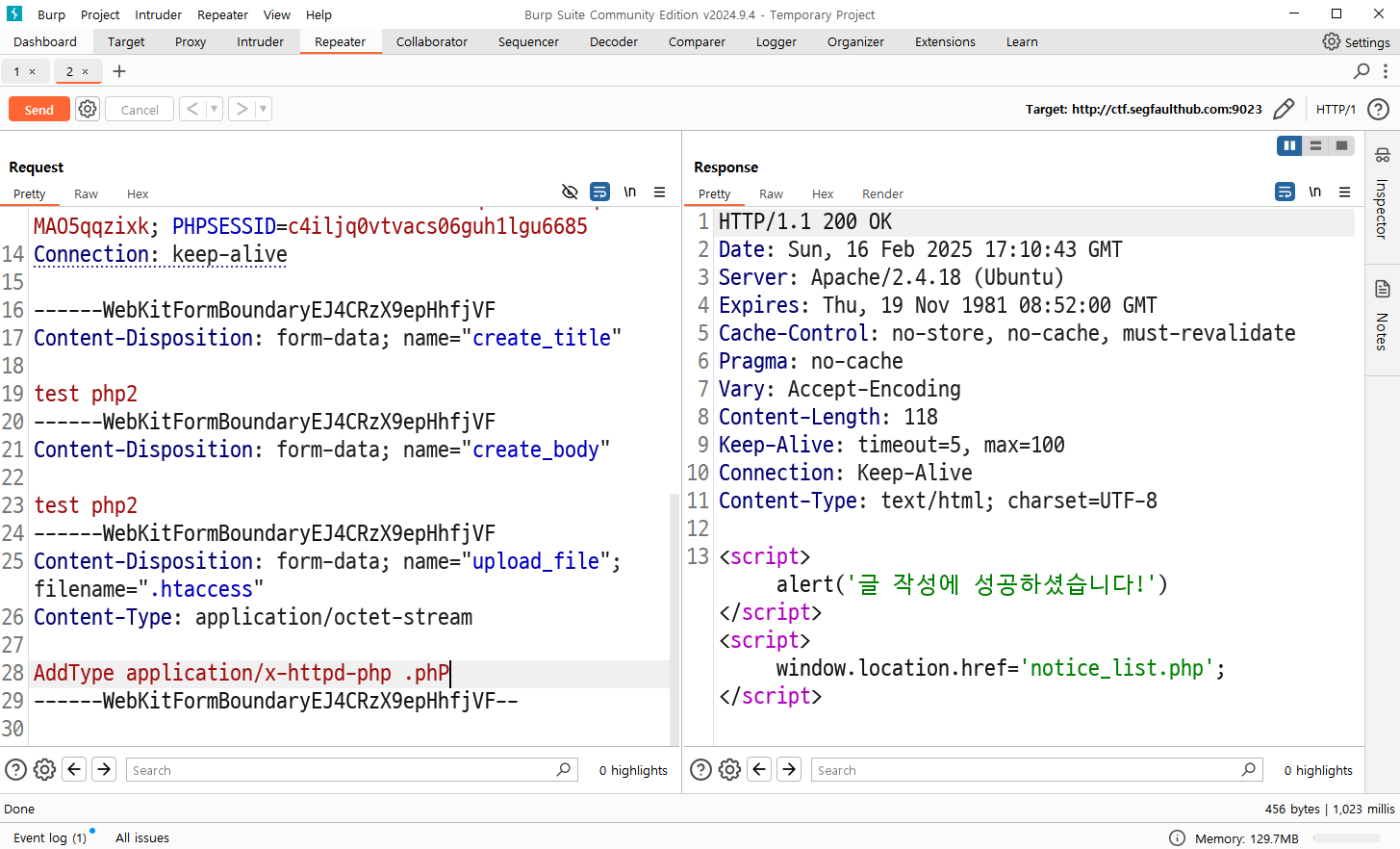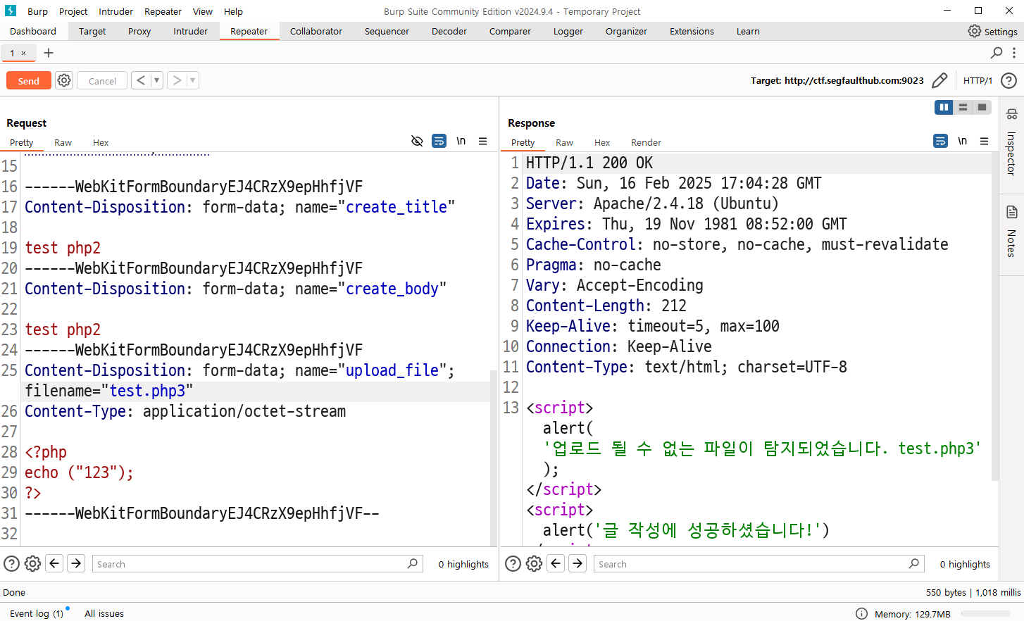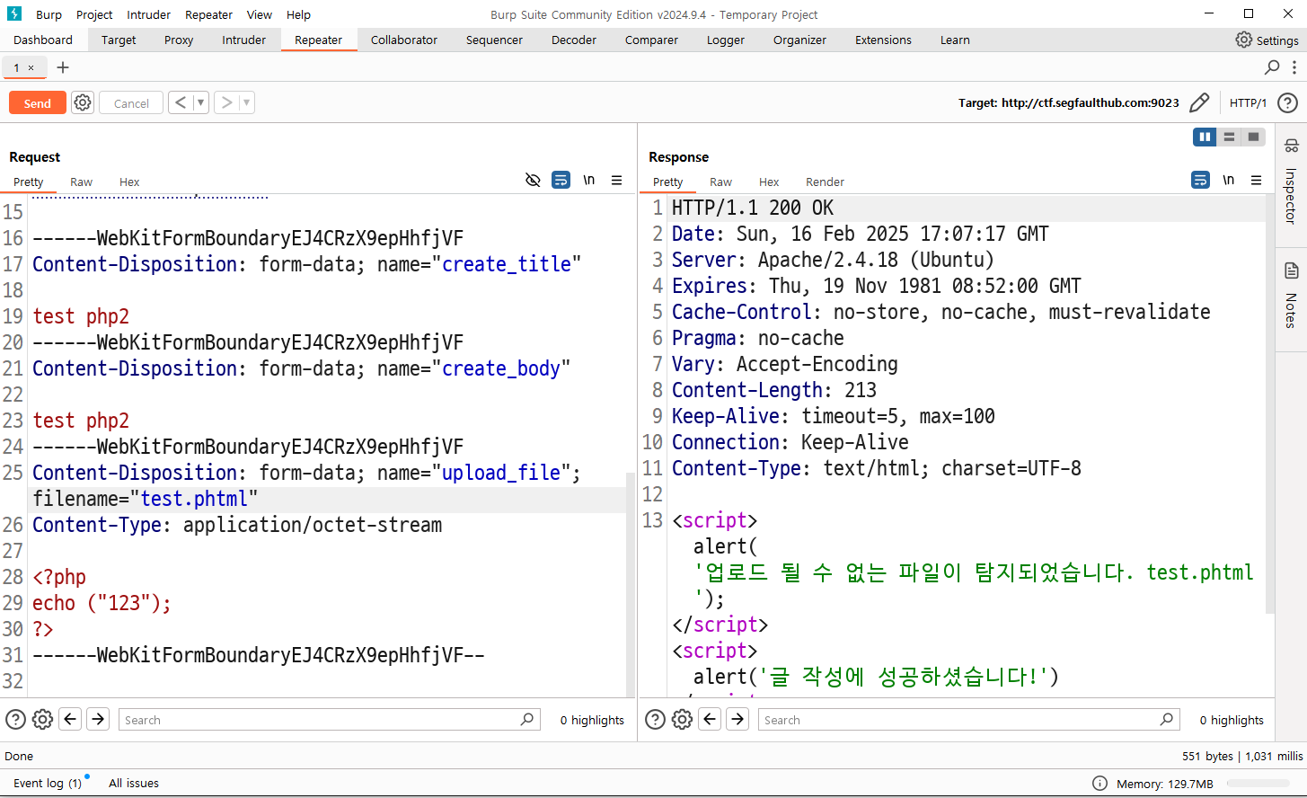 Burp의 Repeater 기능을 이용해서 우회 확장자 찾기 (실패)