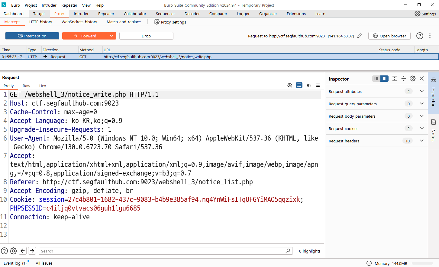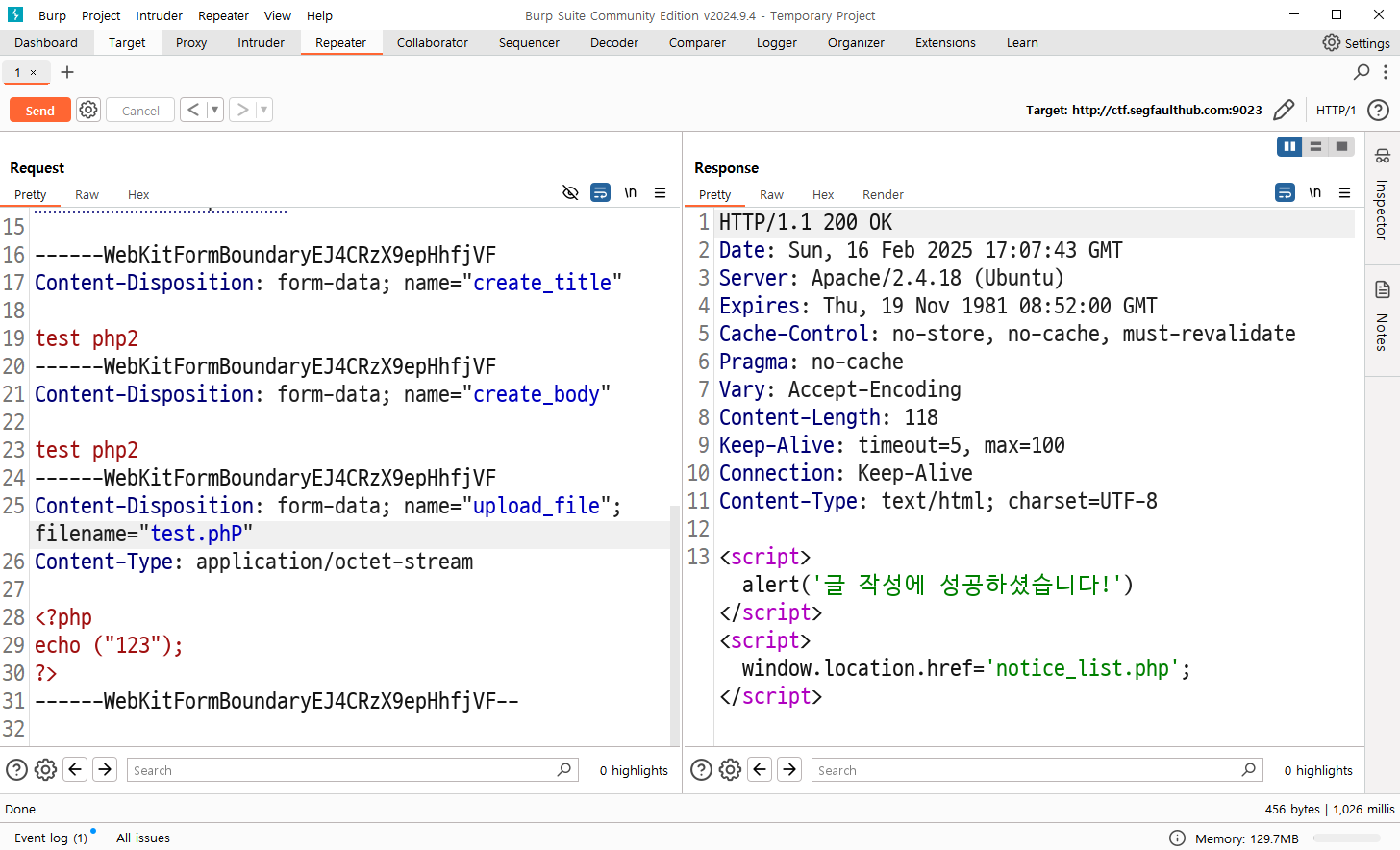 Burp를 이용해서 글쓰기 페이지 요청을 가로챕니다.
