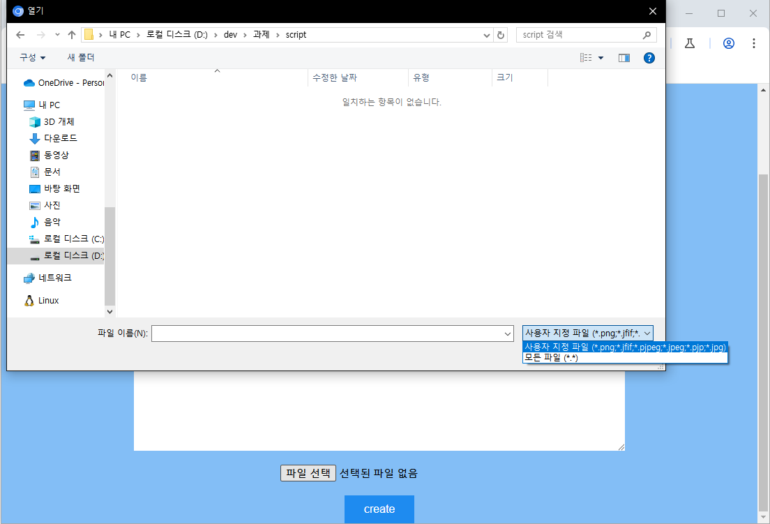 input 태그의 accept 속성을 이용해 이미지만 선택이 가능하도록 해두었지만 사용자가 쉽게 바꿀 수 있습니다.