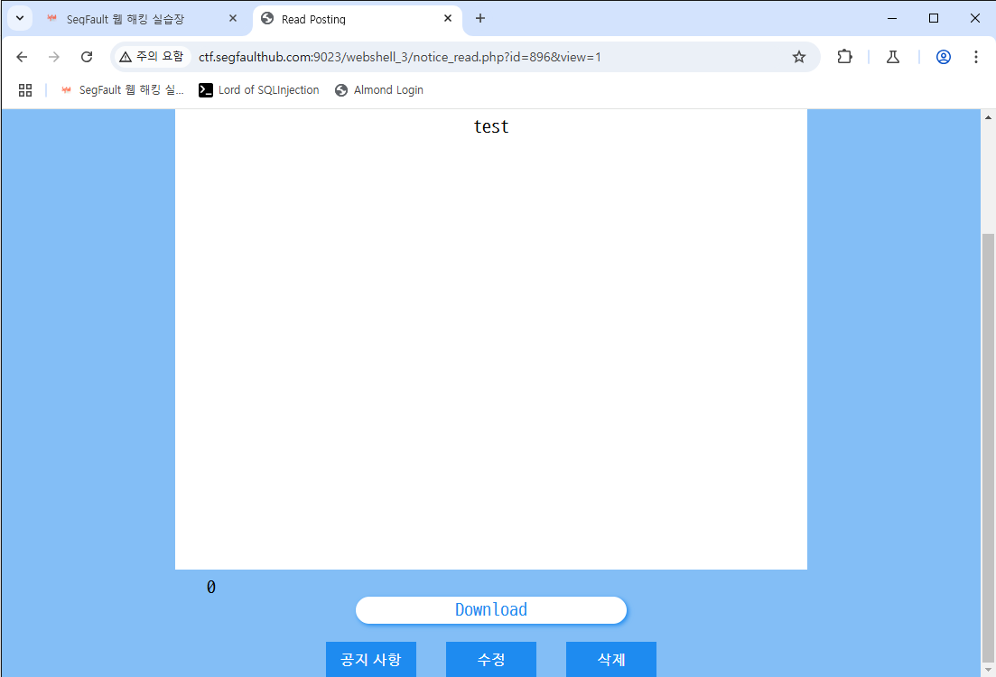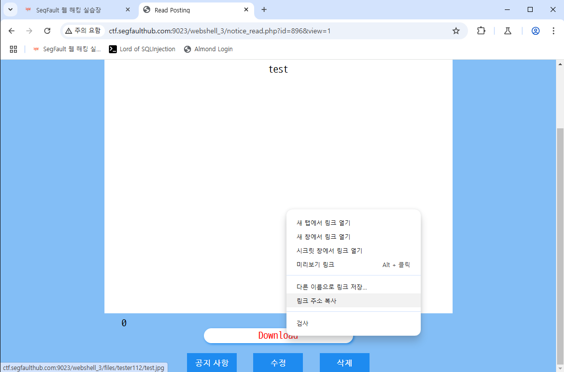 게시글에 업로드한 파일의 다운로드 링크가 있는지 확인합니다.