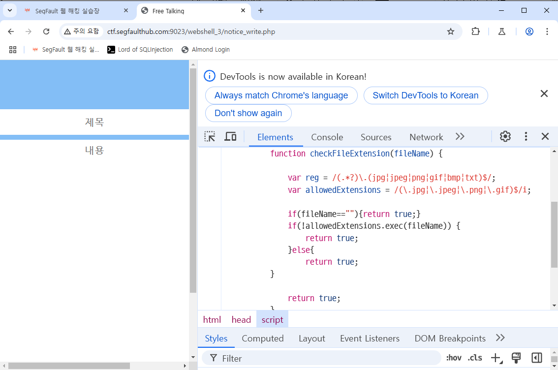서버에서 php나 phtml과 같이 php코드로 실행될만한 확장자를 모두 차단하고 있습니다.그래서 .htaccess 파일을 업로드하여 phP 확장자를 가진 파일 역시 php 코드로 실행하도록 서버 설정을 덮어씌우기로 했습니다.